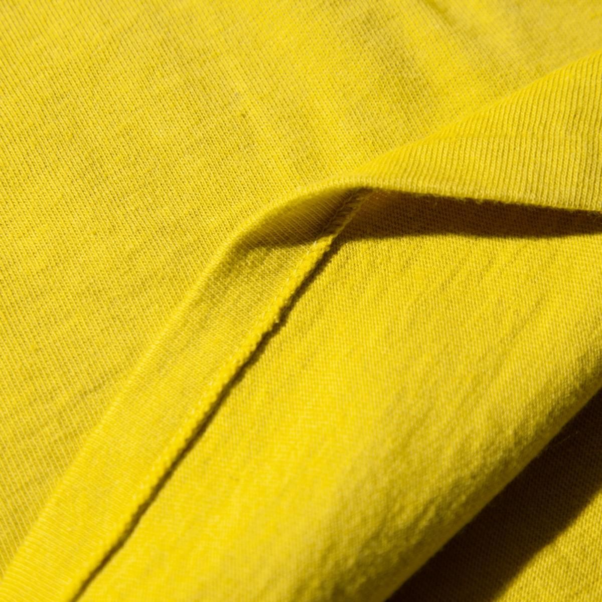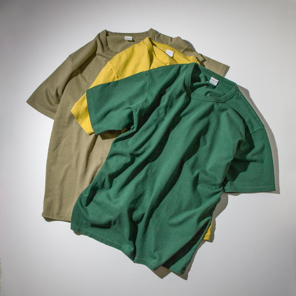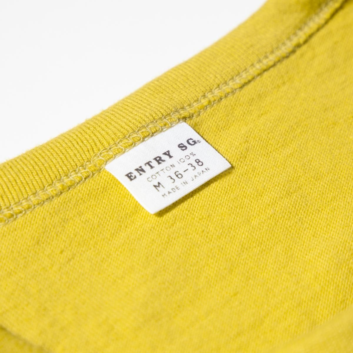 エクセレントウィーブのディティールを継承し、着用を繰り返し経年変化した10年後のエクセレントウィーブをイメージした「after 10 years EW Tee」。ENTRY SG.の素材の中ではミディアムウェイトのエクセレントウィーブと同じく、吊り編み天竺を使用しています。パターン制作にはひと手間を加え、脇の下から裾にかけてテーパーをかけてやや狭めたシルエットにし、経年による裾の伸びを目立ちにくくするとともに、着用時の裾のヒラつきを抑えたシルエットです。
