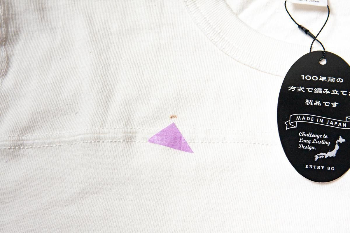 現在では希少となる旧式の編み機を使用して編み立てた素材を使用しており、もちろんA品と変わらぬ着心地をお楽しみいただけます。個性ある一点モノとして、この製品があなたのお気に入りの一着となってくれましたら嬉しく思います。